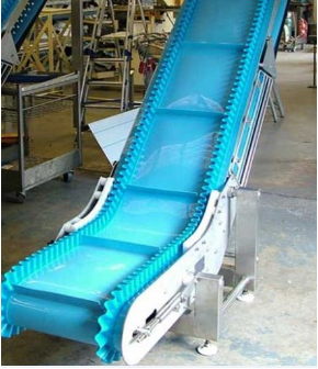 PU白色食品輸送帶(裙邊擋板帶),擋邊起防止物料測(cè)滑撒落的作用。為便于轉(zhuǎn)彎,裙邊設(shè)計(jì)成波紋狀;橫隔板的作用是承托物料,為了實(shí)現(xiàn)大傾角輸送,采用T型TC型。檔邊和橫隔板是用二次硫化的方法與基帶連接的,具有很高的連接強(qiáng)度。用于輸送易散落的粉狀、粒狀、小塊狀、糊狀及液態(tài)狀物料。